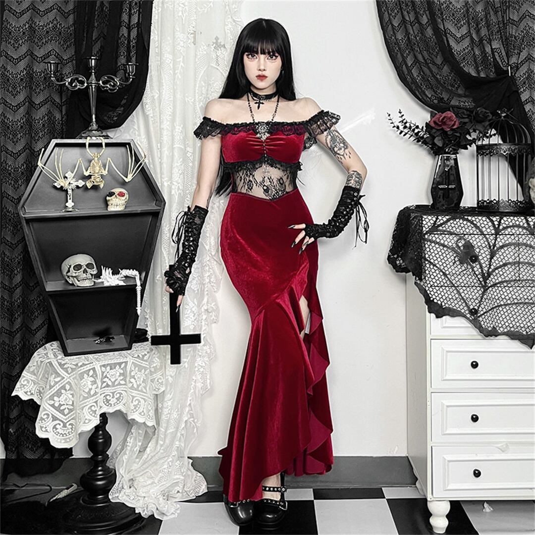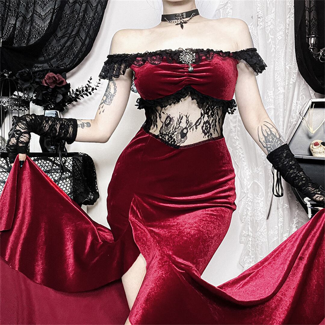 ハロウィン 切り替え ファッション レッド オープンショルダー スリット ワンピース120493014