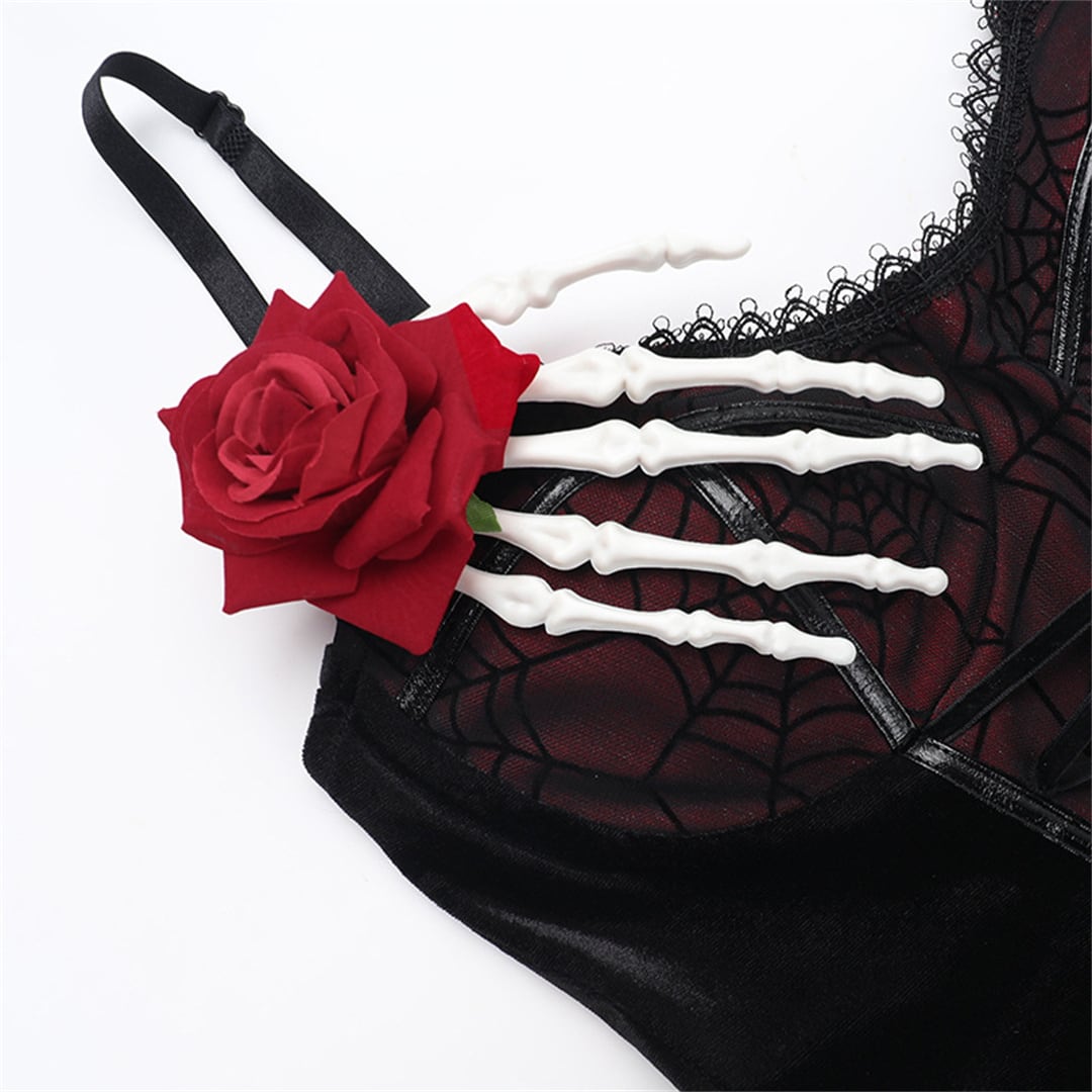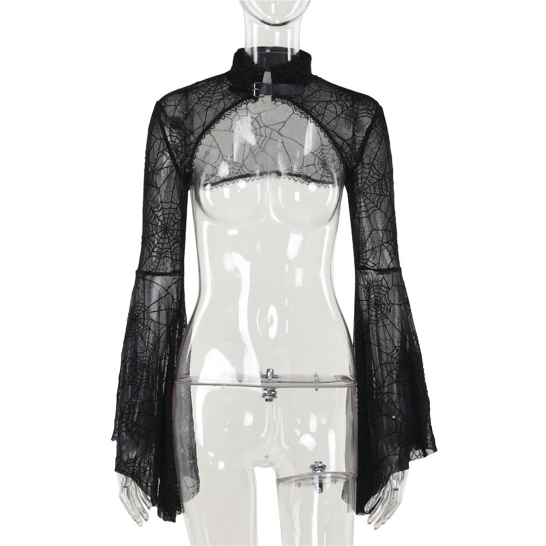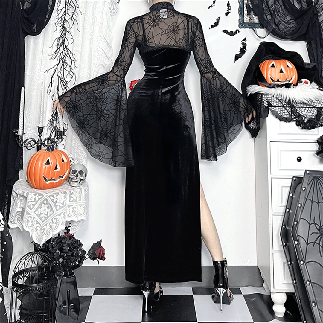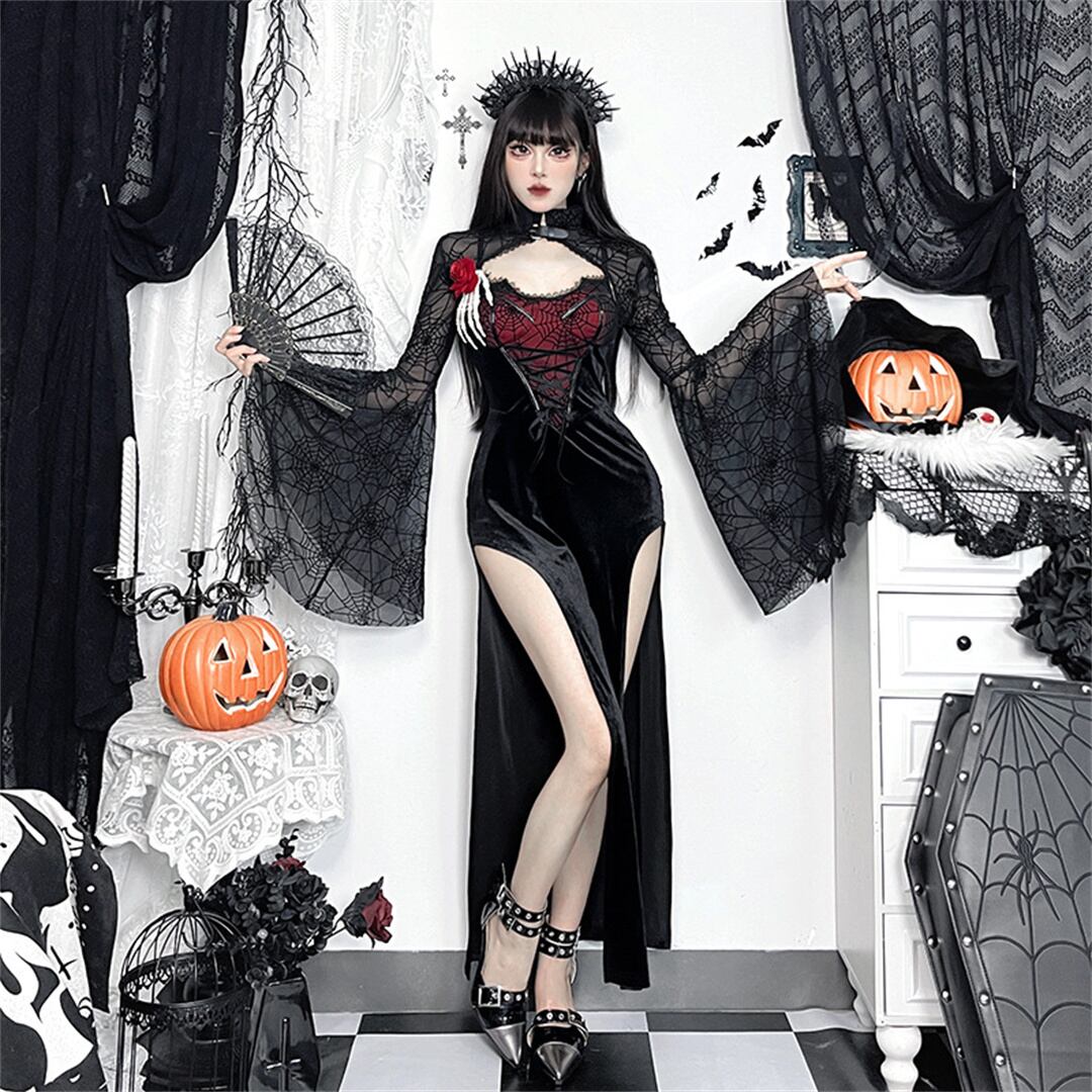 (2点セット)ハロウィン トップス+ワンピース ゴシック スリット 蜘蛛の巣 セットアップ120623456