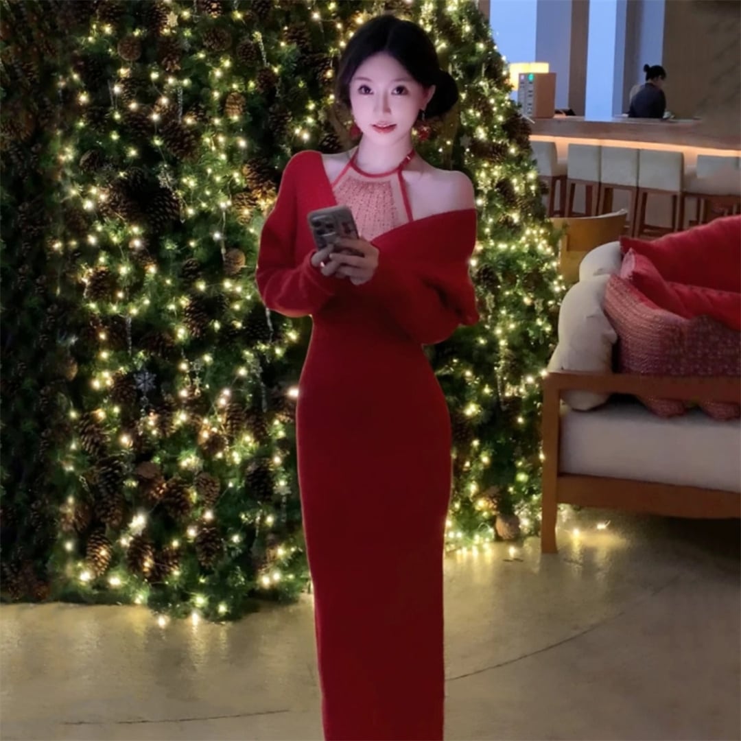 クリスマス セクシー ニット オープンショルダー スリミング効果 レッド ワンピース124679317