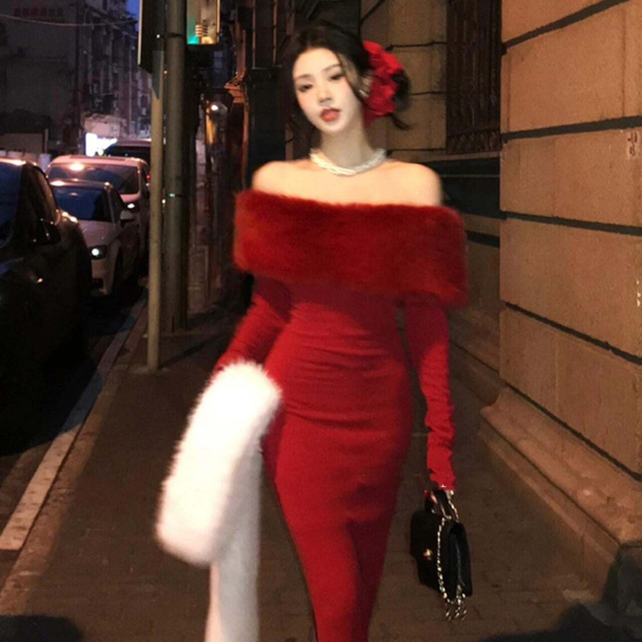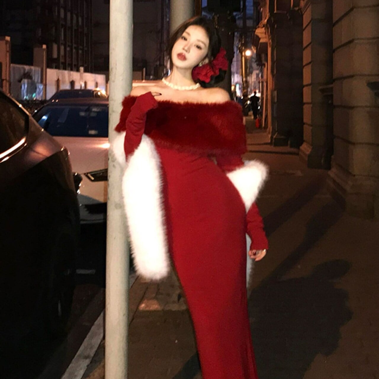 クリスマス エレガント スリム オープンショルダー スリ切り替え レッド ワンピース124680194