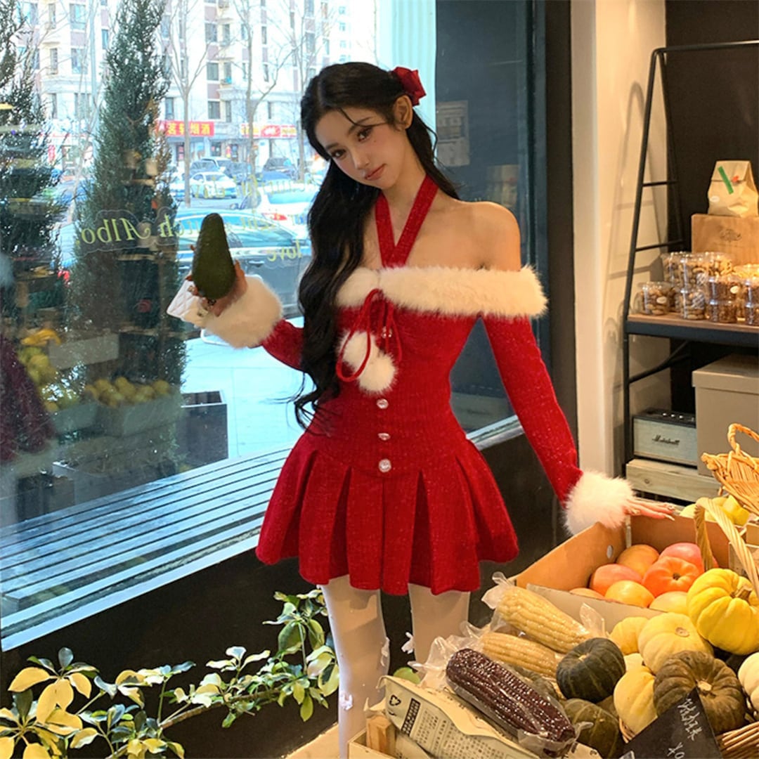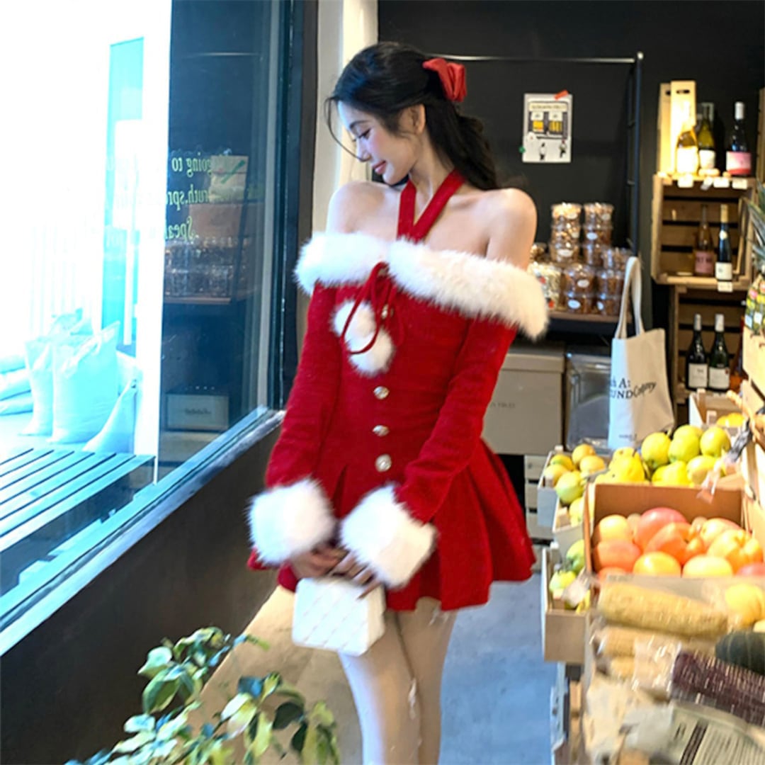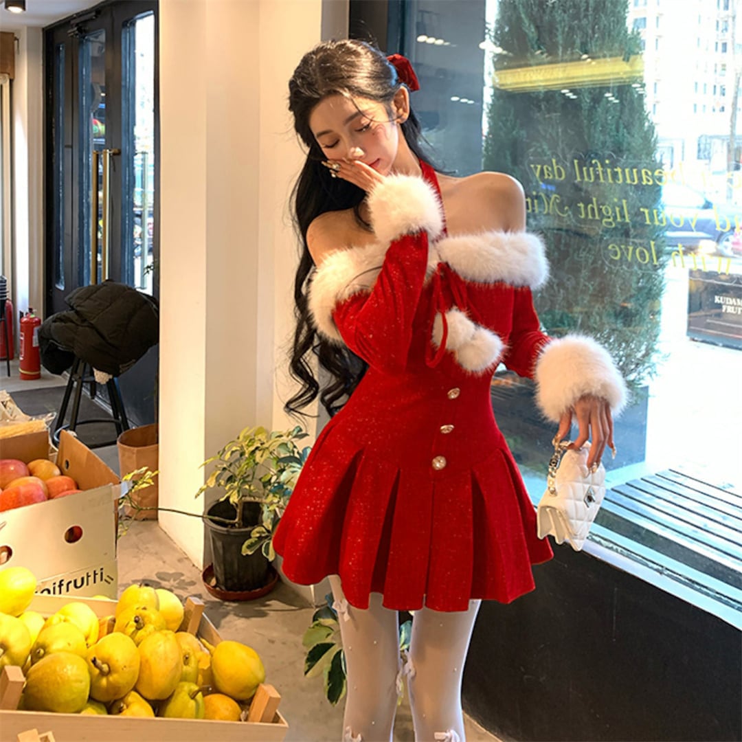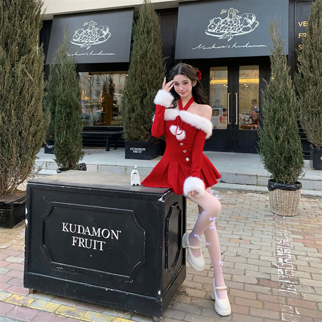 クリスマス エレガント ホルターネック 切り替え レッド 足長見え ワンピース124874730