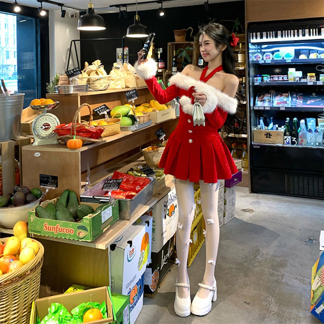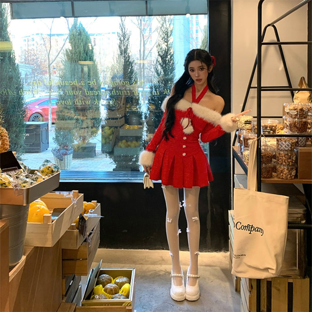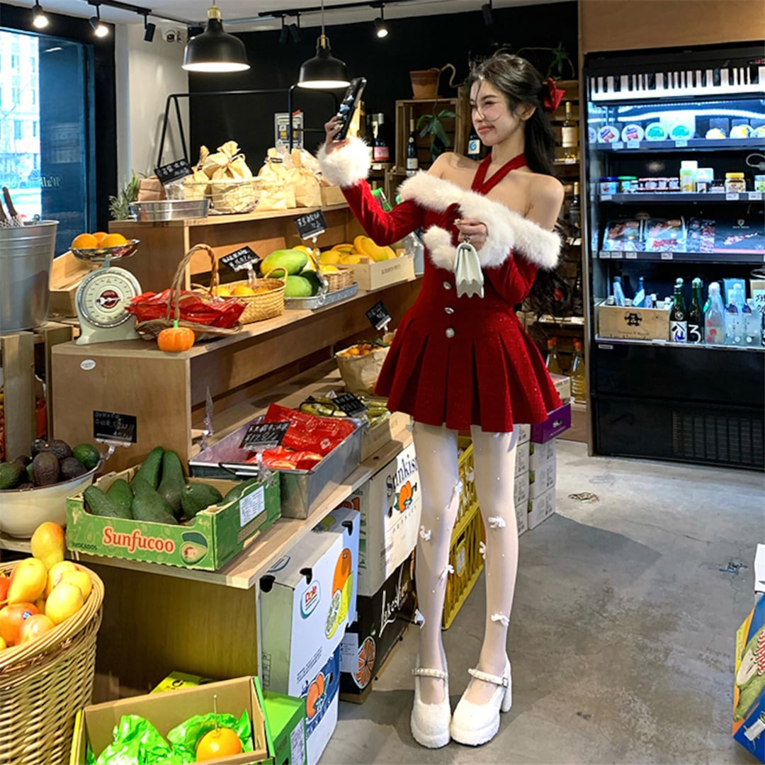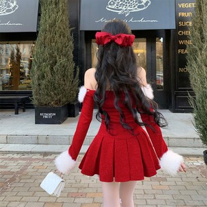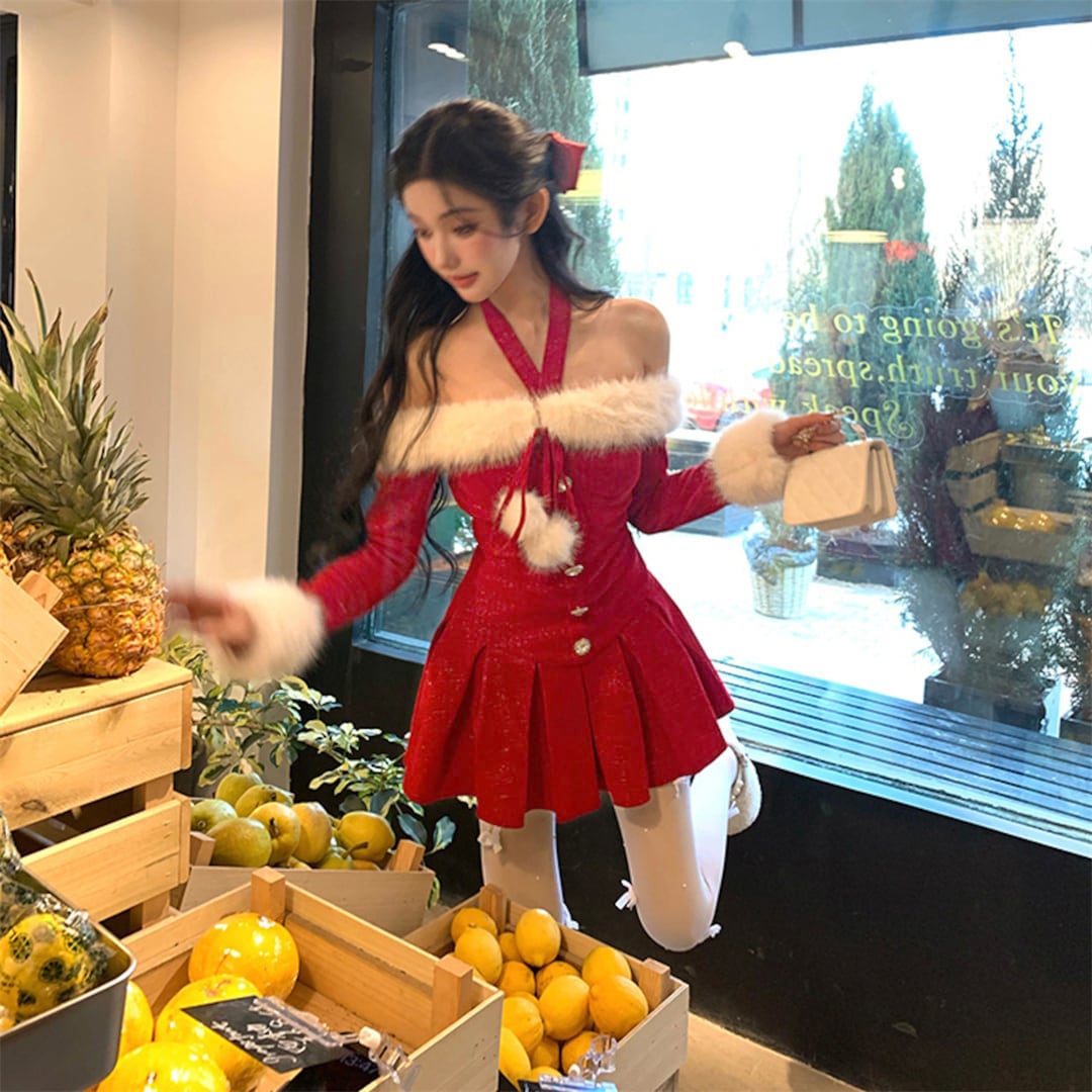 クリスマス エレガント ホルターネック 切り替え レッド 足長見え ワンピース124874730