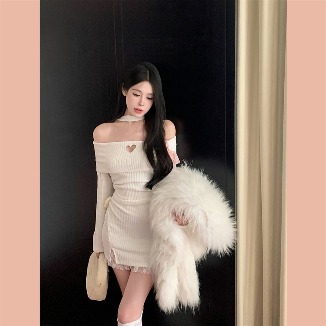 クリスマス スリミング ホルターネック オフショルダー 透かし彫り ホワイト ワンピース124972837