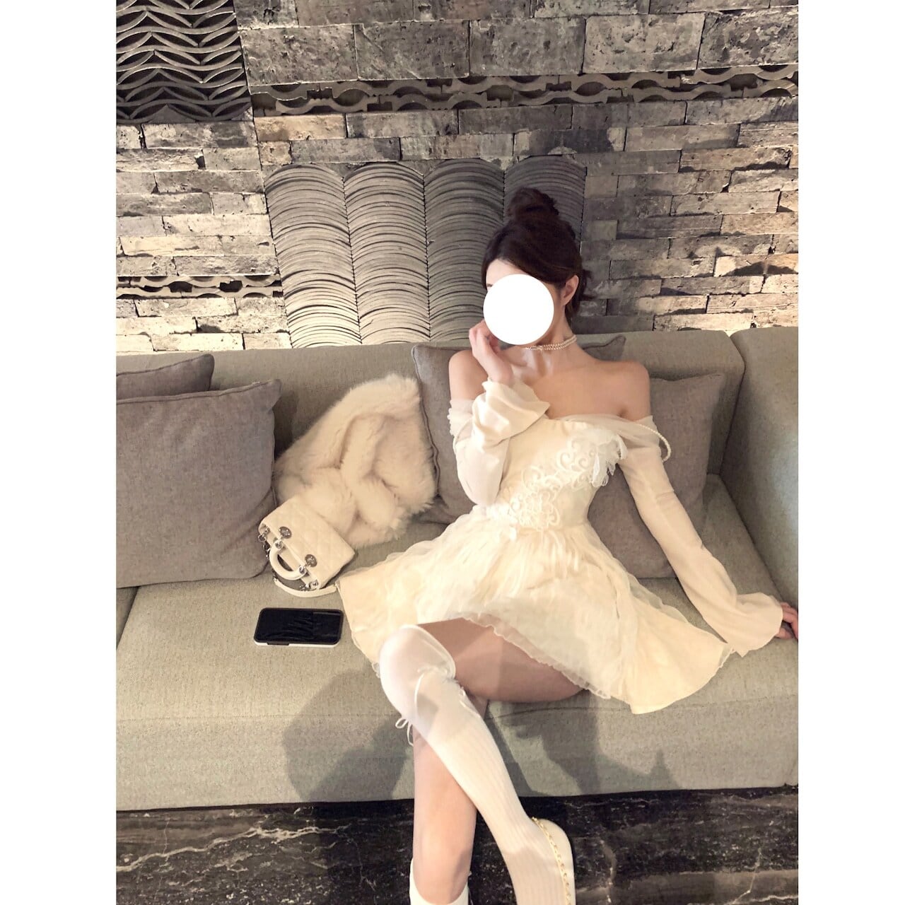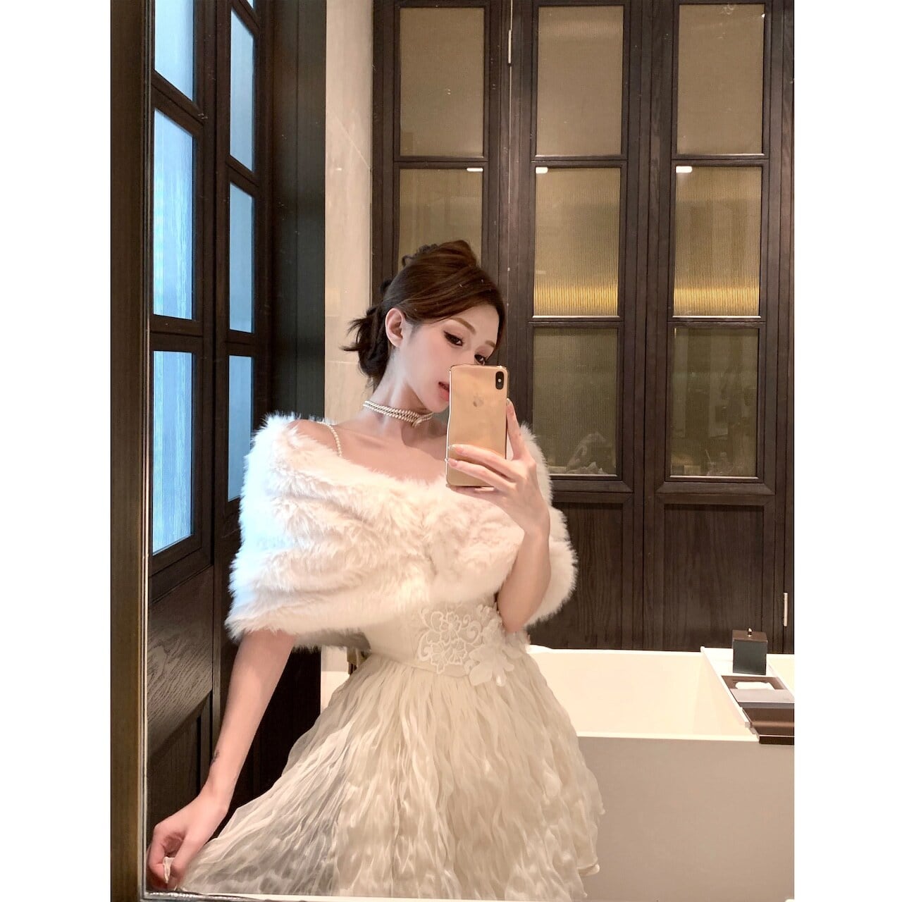 (2点セット)クリスマス パーティー レースオフショルダーワンピース+仿ラビットファー ショール ホワイト125796675
