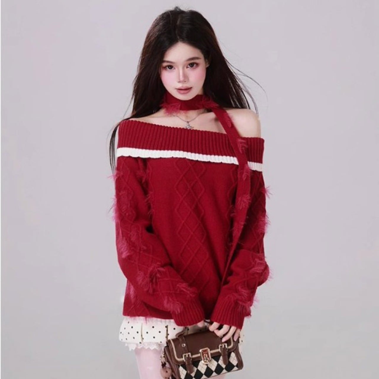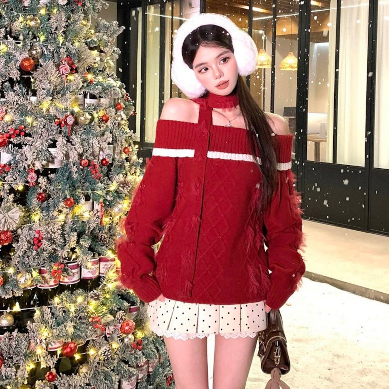 クリスマス オフショルダー ニット レッド キュートトップス125797887
