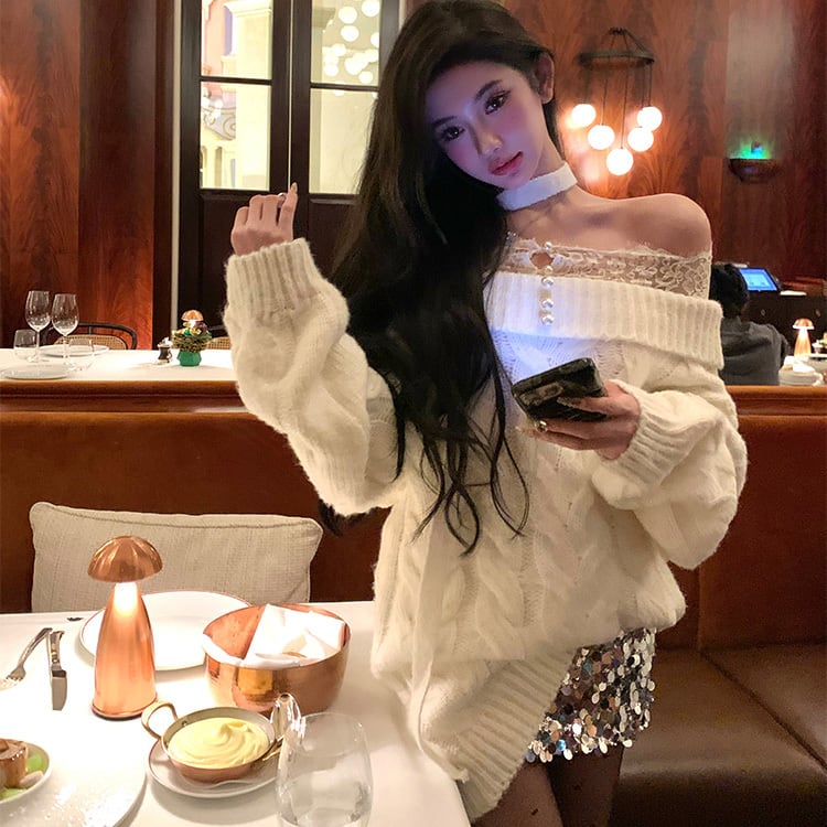 クリスマス オフショルダー ニット ホワイト レース トップス126088613