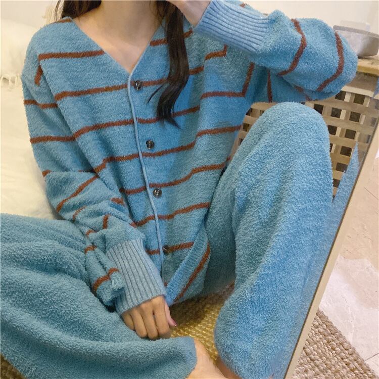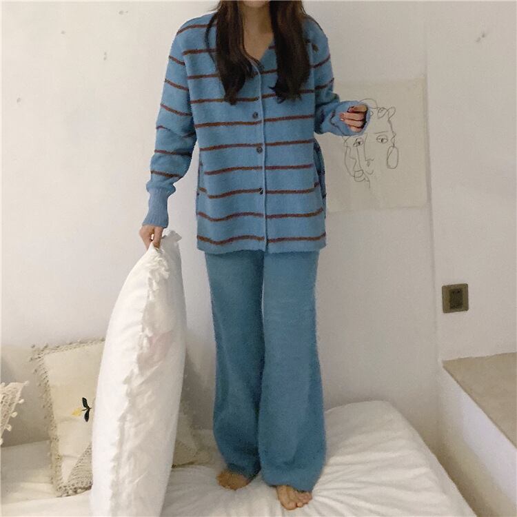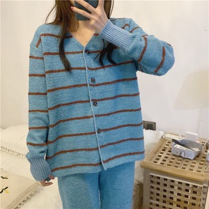 おすすめ ストライプ柄 ニット生地 秋冬 カジュアル Vネック 長袖セット・パジャマ36538199