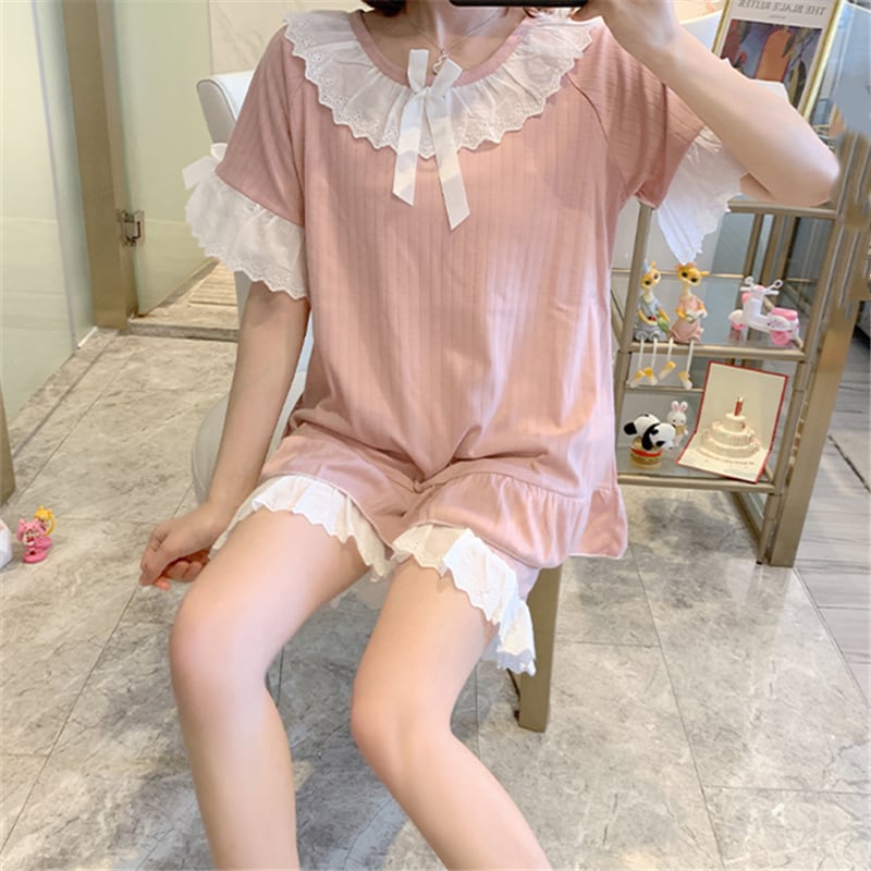 カジュアル 無地 レース ボウタイ M L LL 2XL 半袖セット・パジャマ36698952