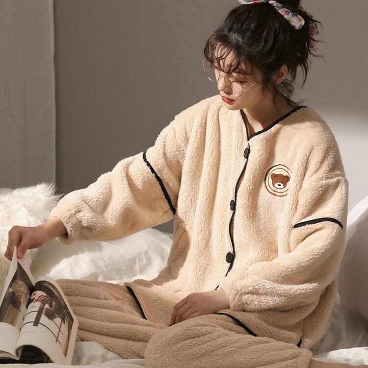 かわいい 暖かい Vネック カートゥーン ボタン付き 無地 長袖セット・パジャマ36977833