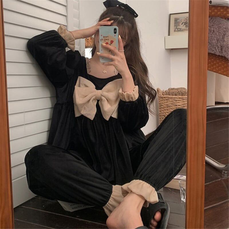 スウィート M-4XL ボウタイ スクエアネック 切り替えし 韓国系 長袖セット・パジャマ36981712