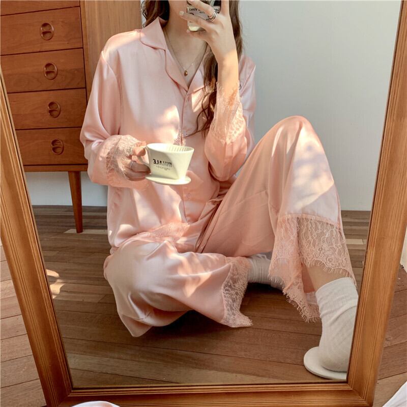 通気性がいい レース 無地 折り襟 ボタン付き シンプル ins 長袖セット・パジャマ37063467