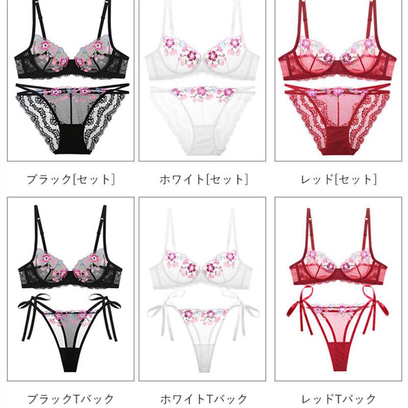 (A-Dカップ)大きい胸 セクシー レース 透け感 刺繍 花柄 Tバック 下着 ブラ&ショーツセット37077626