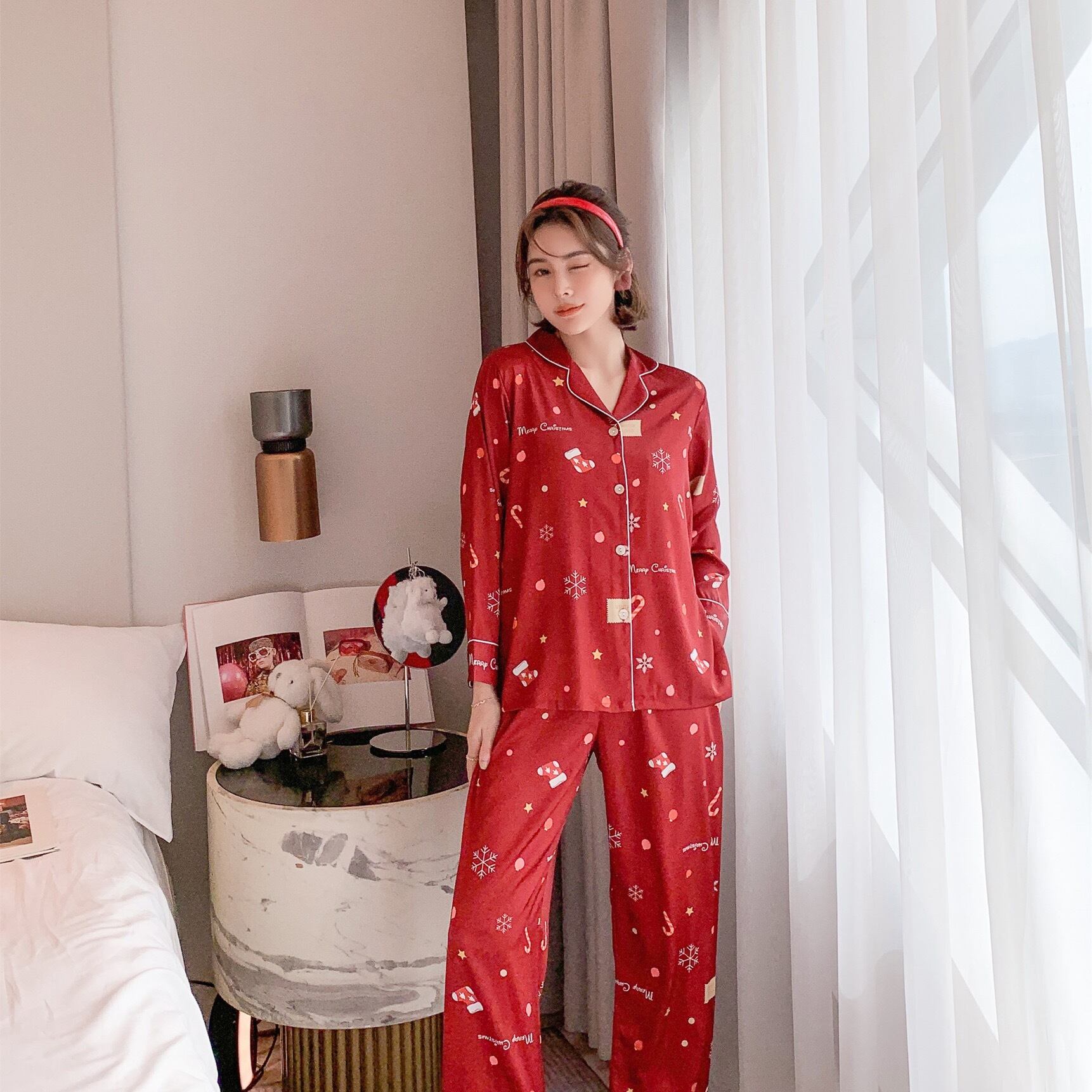 クリスマス ルームウェア プリント シルキー 部屋着 前開きタイプ レディース 春秋 長袖セット・パジャマ37160905