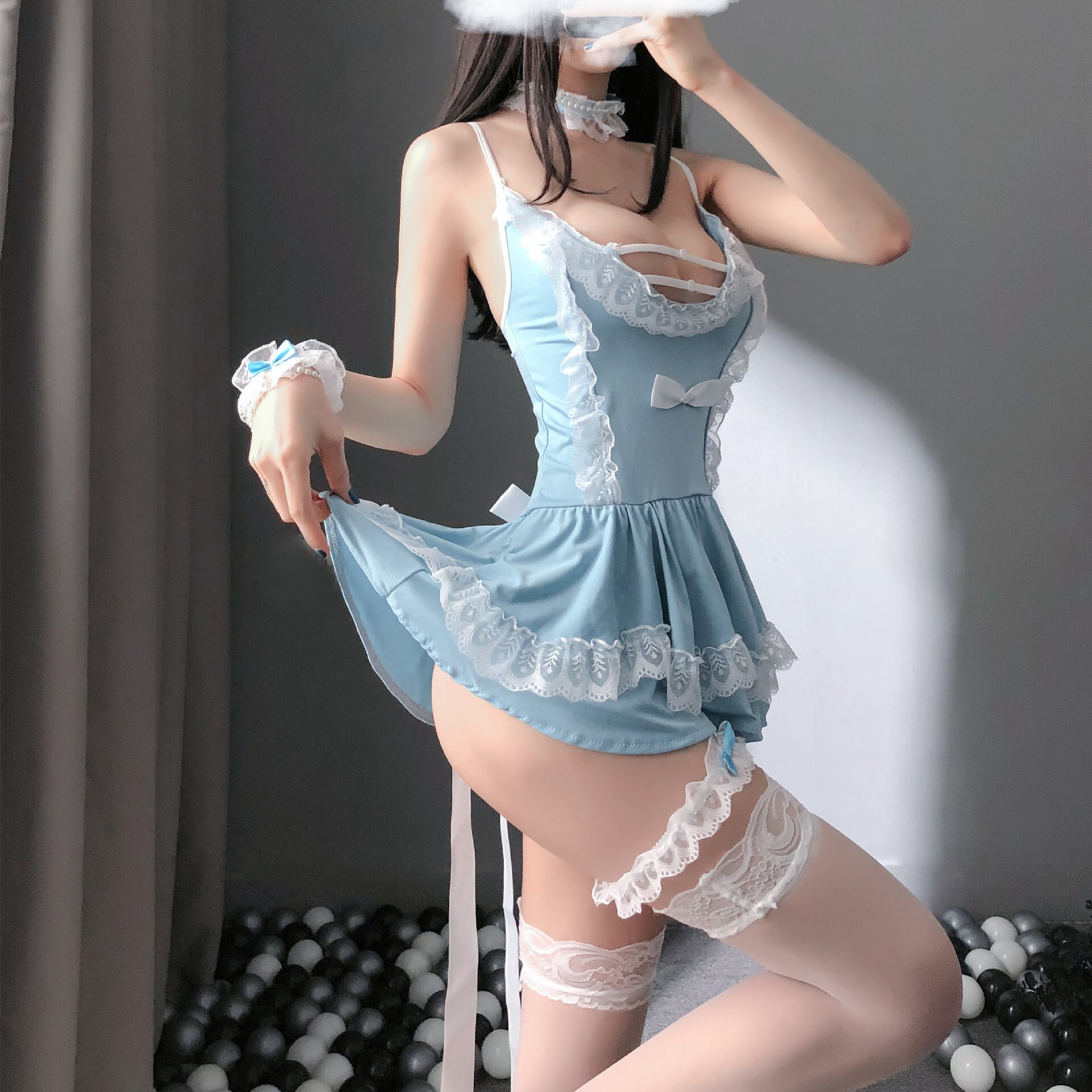 (5点) 人気満々 メイド服 ボウタイ キュート レース ブルー セクシー ランジェリー45627270