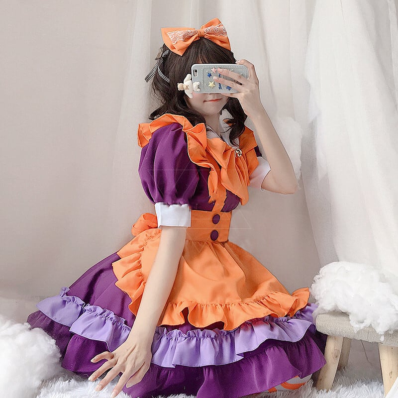 (4点セット)オレンジ かぼちゃ ハロウィン メイド服 可愛い コスプレ ワンピース45899314