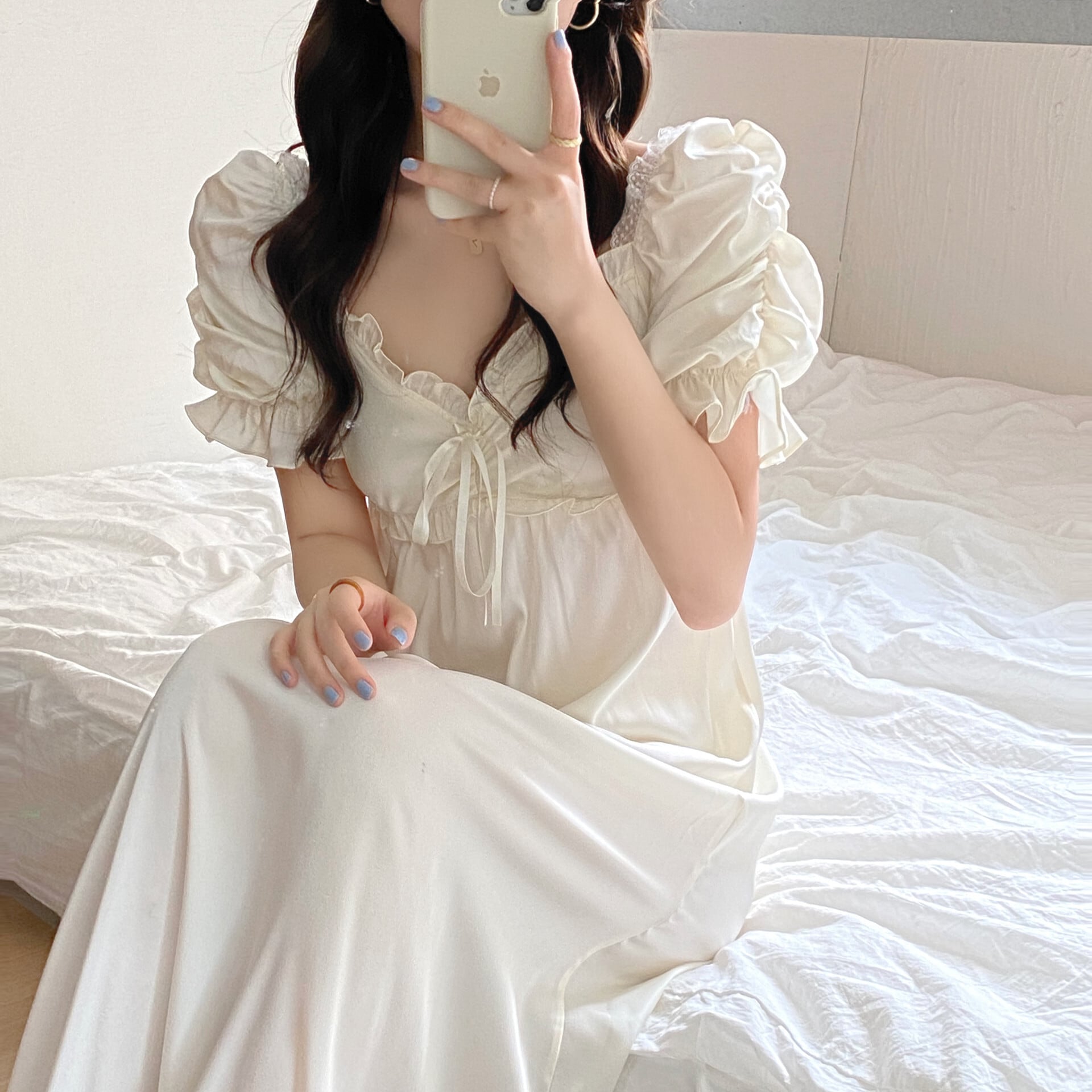スウィートプリンセス シルキーサテン 光沢 涼しい パジャマ エレガント パフスリーブ 寝巻き ワンピース46621689