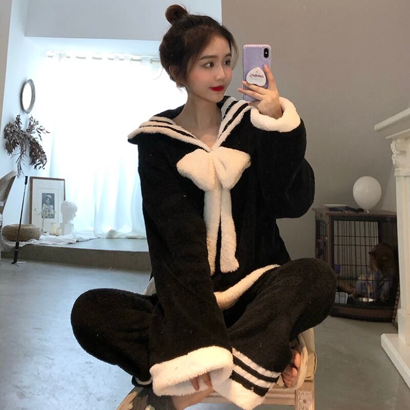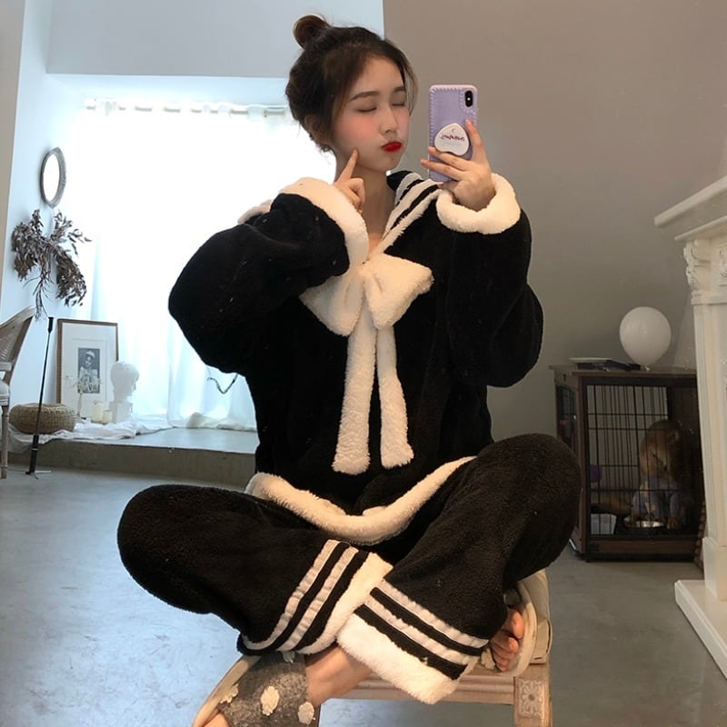 リボン 秋冬 可愛い 韓国系 スウィート ルームウェア 厚い保温 長袖セット・パジャマ54782491