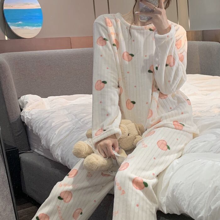 もも 花 プリント スウィート2色 秋冬 ラウンドネック 厚い保温 長袖セット・パジャマ54787506