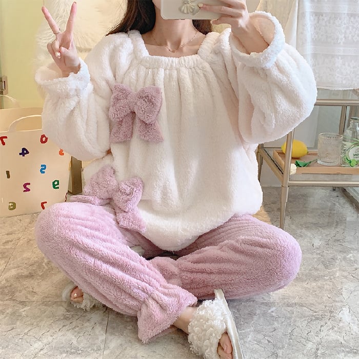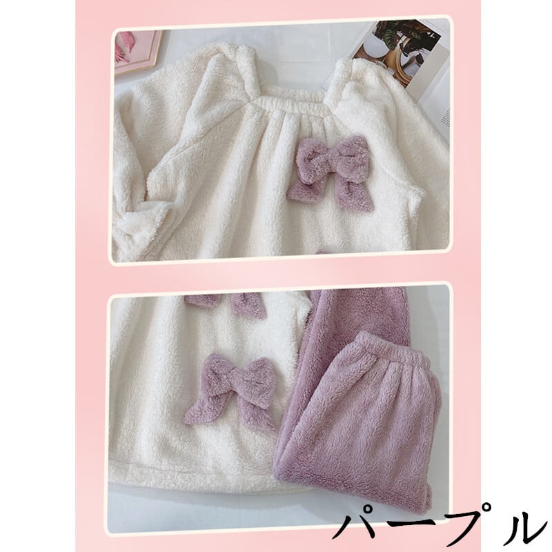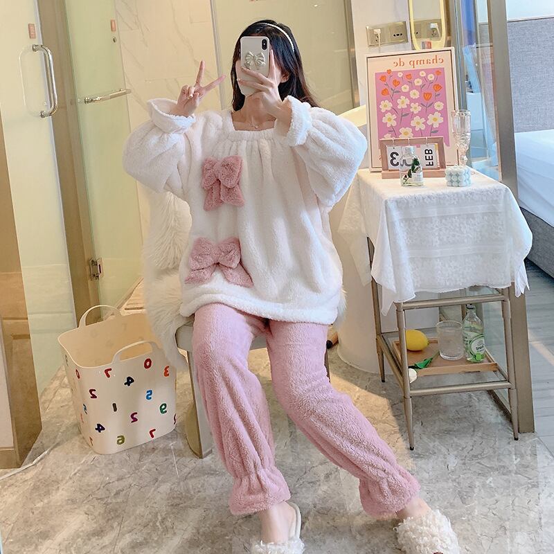 ボウタイ 韓国系 スクエアネック 可愛い 秋冬 スウィート 厚い保温 長袖セット・パジャマ55920175