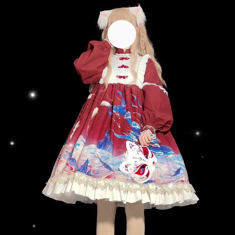 中国風 プリント リボン OP かわいい 秋冬 Lolita 全2色 ロリータ 長袖ワンピース59440633