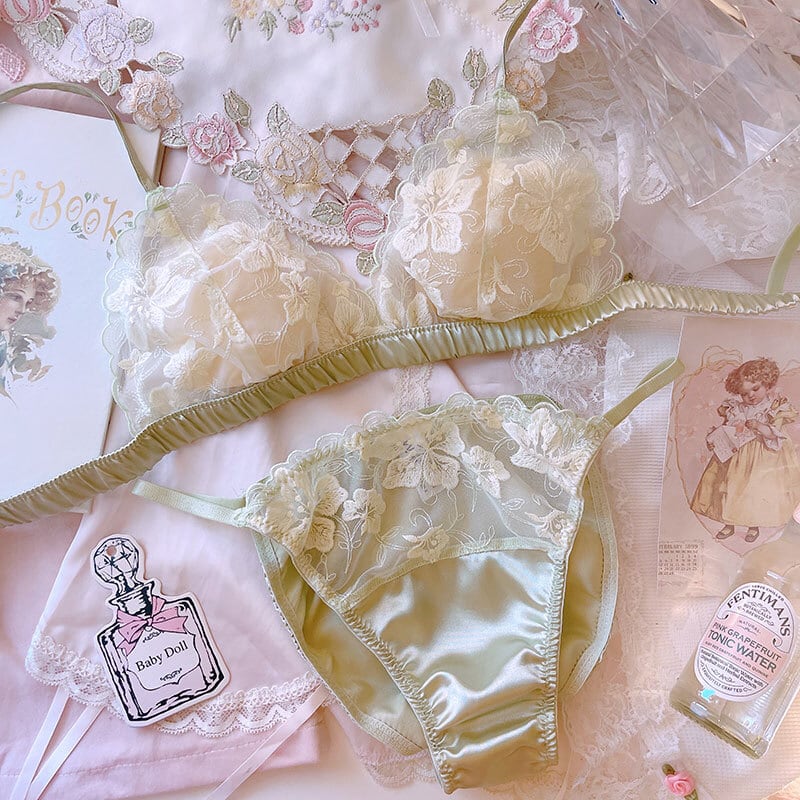 (A-Cカップ)フランス レトロ レース 花 刺繍 グリーン ワイヤーなし ブラ&ショーツセット