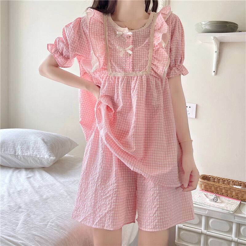 韓国系 スウィート少女 チェック柄 リボン 2色 夏 半袖セット・パジャマ61339774