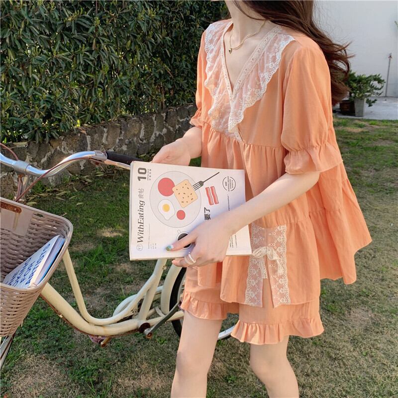 スウィート オレンジ レース スリット リボン 可愛い 夏 半袖セット・パジャマ61340341