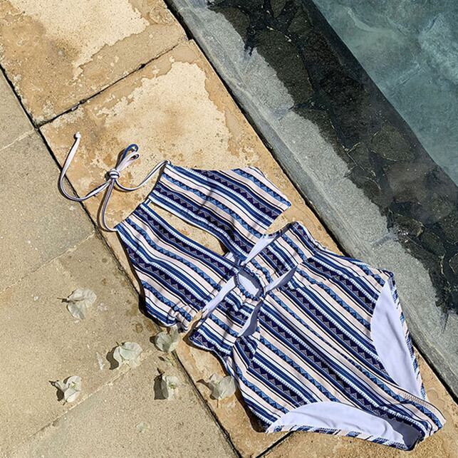 日系 リボン ストライプ柄 透かし彫り セクシー モノキニ M L LL 体型カバー レディース 水着61428251