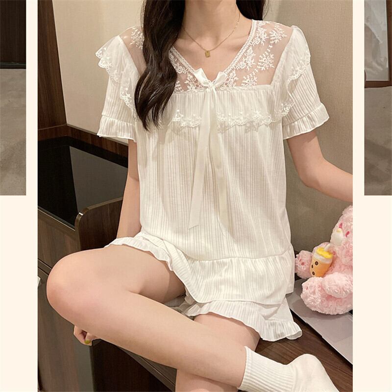 流行兆し ボウタイ かわいい 無地 夏 レース ルームウェア 少女 レース 半袖セットパジャマ61896362