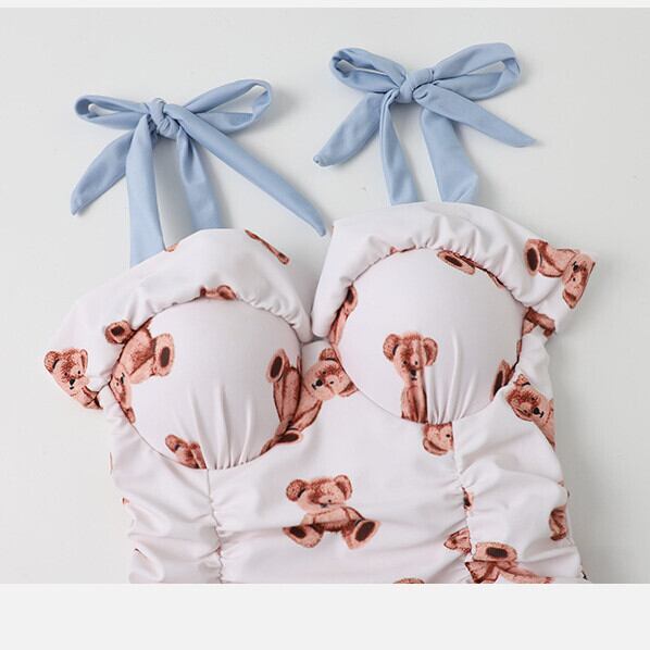 日系 ベビーブルー 可愛い リボン 小熊 プリント ワイヤー入り ワンピース 温泉 体型カバー 水着63993167