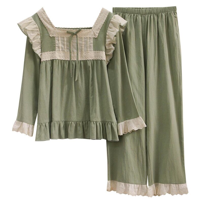 韓国系 グリーン スクエアネック フリル リボン 清新 春秋 リボン 部屋着 長袖セット・パジャマ65997234