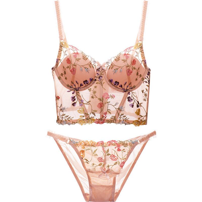 (ABCカップ)ロマンチック フランス風 刺繍花 超薄型 ワイヤー入り 下着 ブラ&ショーツセット66673949