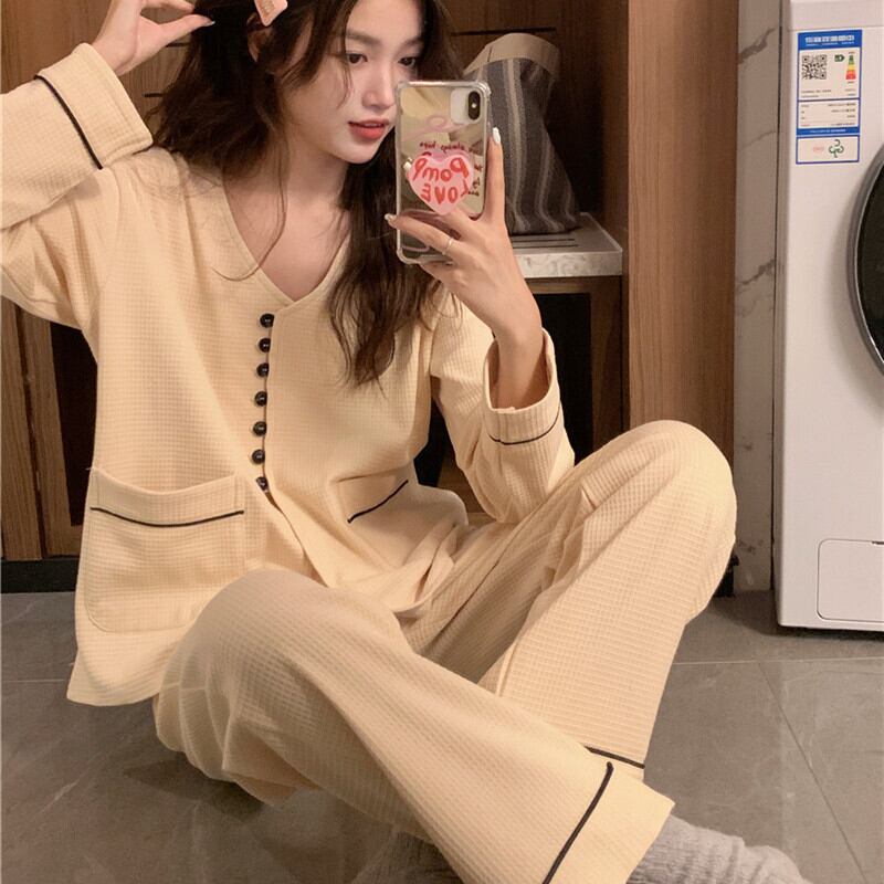 日系 無地 Vネック シンプル 前開き 柔らかい 秋冬 部屋著 長袖セット・パジャマ69317895