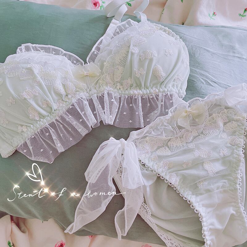 (A-Cカップ)キュート キャンディー 刺繍 リボン レース 2色展開 ワイヤーなし ブラ&ショーツセット72128229