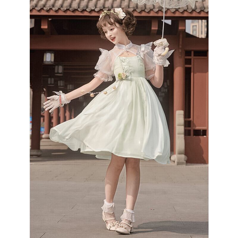 セットアップ チャイナ風 あつさり 透け感 刺繍 半袖 かわいい ロリータ lolita S M L ワンピース72201610