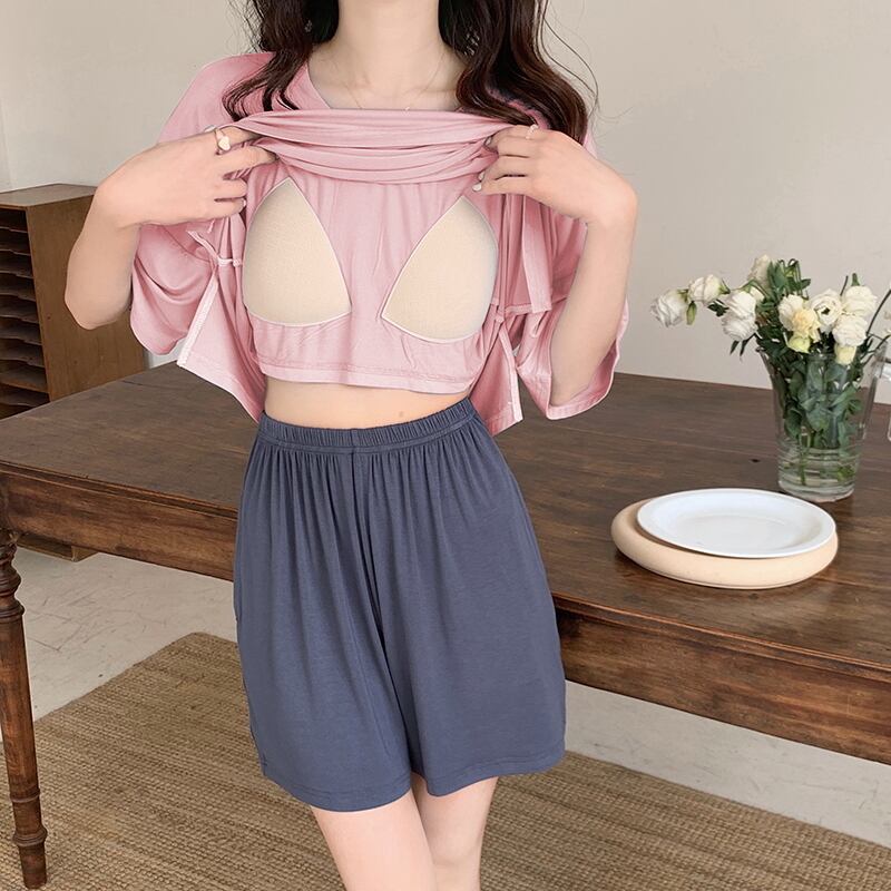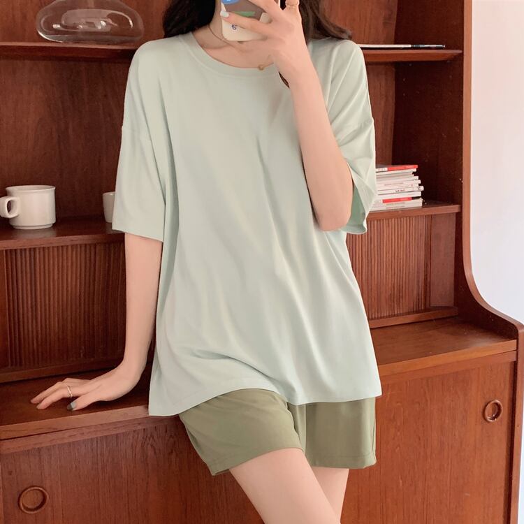 ✿2023春新作 パッド付き 4色展開 シンプル ラウンドネック 無地 M L XL 2XL 半袖セット・パジャマ72877041