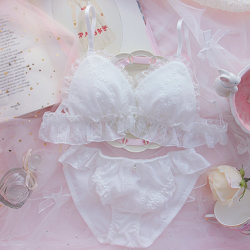 ✿2023春新作(A-Cカップ)絶対可愛い レース ホワイト 刺繍 下着 ワイヤーなし ブラ&ショーツセット72877927