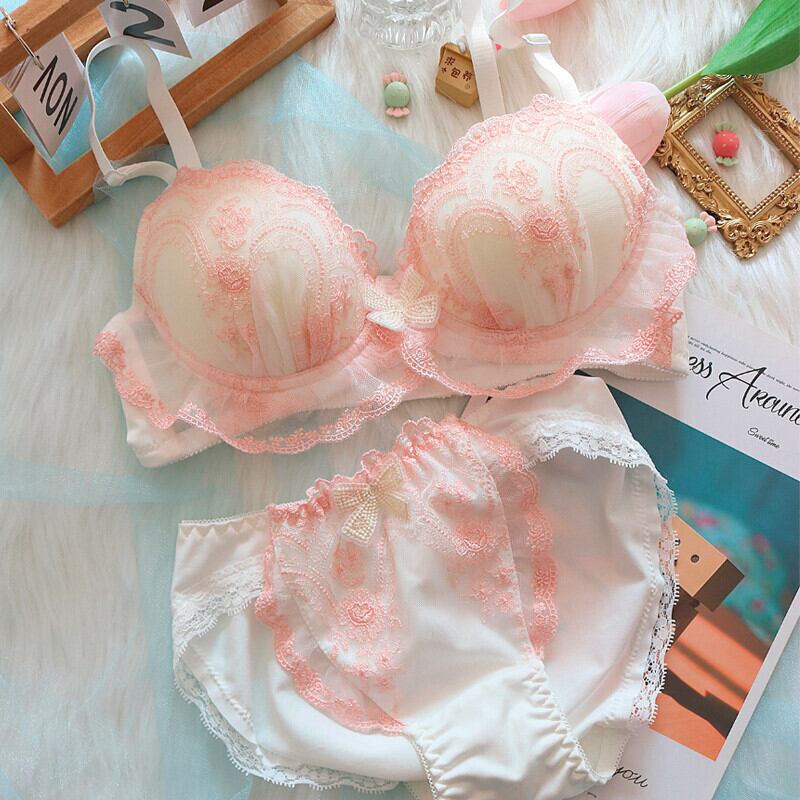✿2023春新作(A-Dカップ)絶対可愛い レース 刺繍 ピンク ワイヤーなし ブラ&ショーツセット73140727