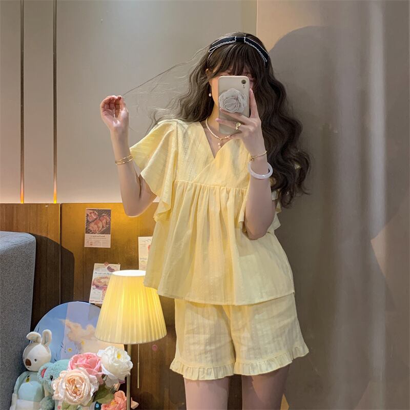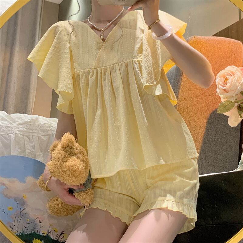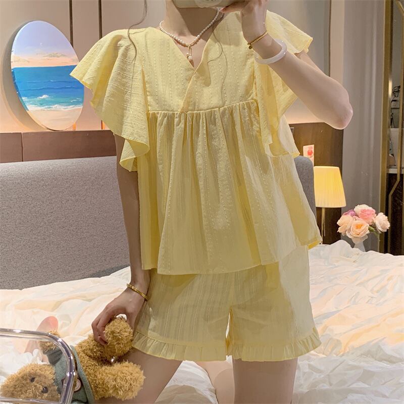 ✿2023春新作 スウィート 無地 フリル 夏 Vネック レディース 半袖セット・パジャマ73210219