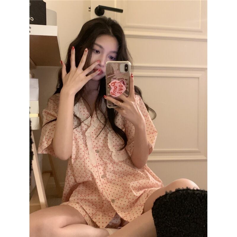 ✿2023春新作 韓国系 ゆったり フリル チェック柄 水玉 夏 レディース 半袖セット・パジャマ73211022