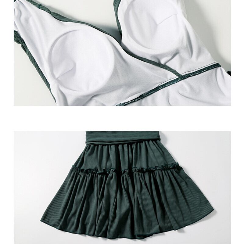セクシー リボン 深緑 フリル 安全パンツ パッド付き M L XL ワンピース 水着73474324