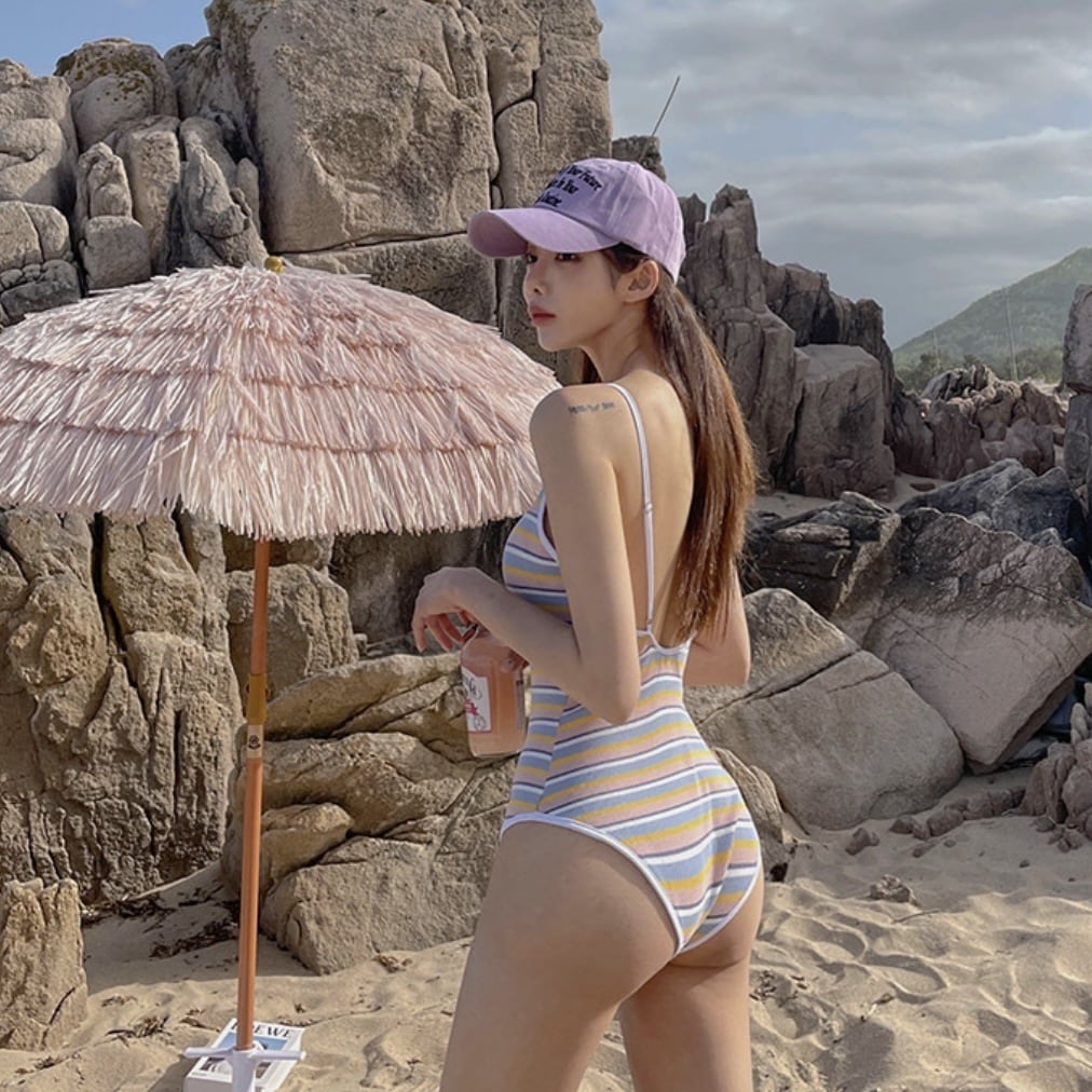 韓国系 横縞 配色 レトロ 可愛い リボン パッド付き M L XL モノキニ 水着73530251