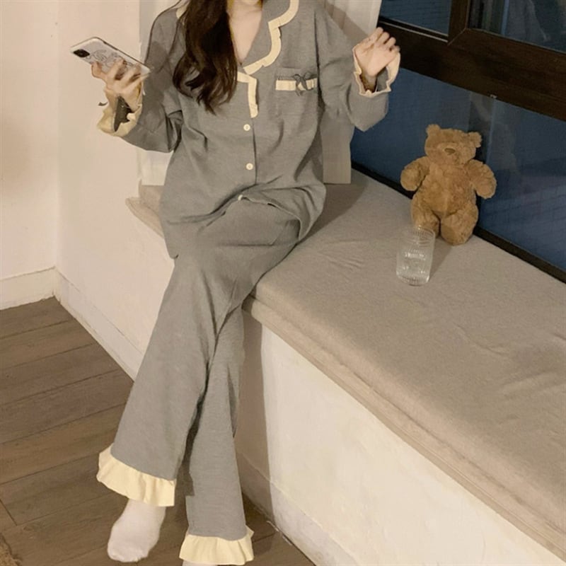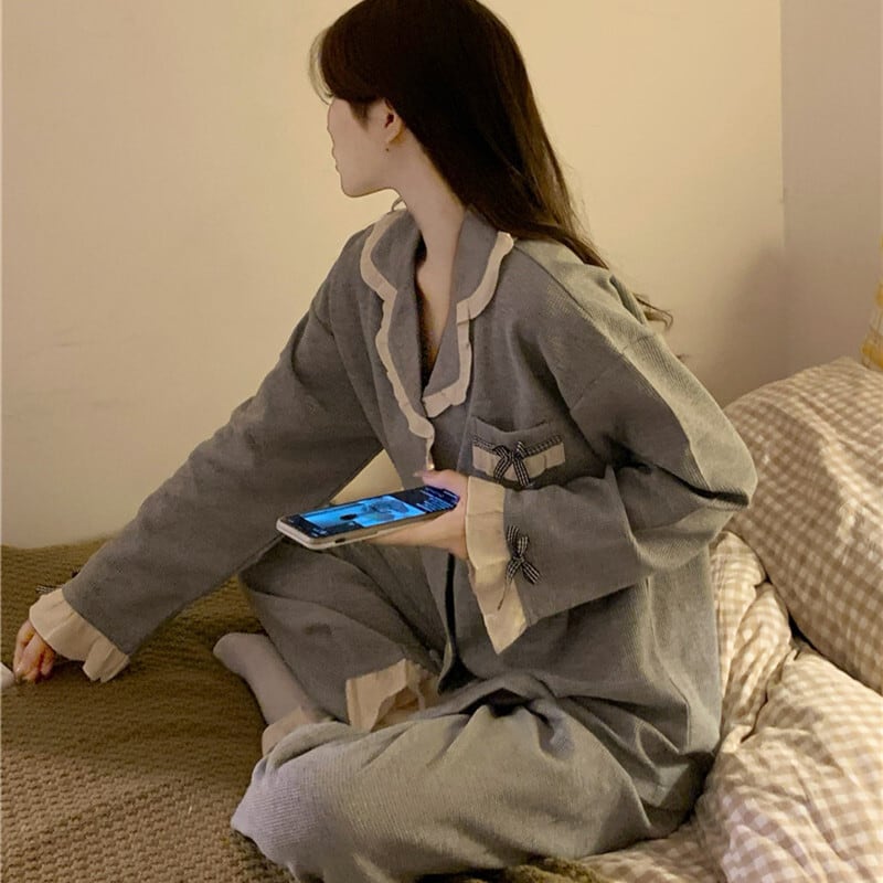 ✿2023春新作 スウィート シンプル フリル グレー リボン レディース 長袖セット・パジャマ73630465