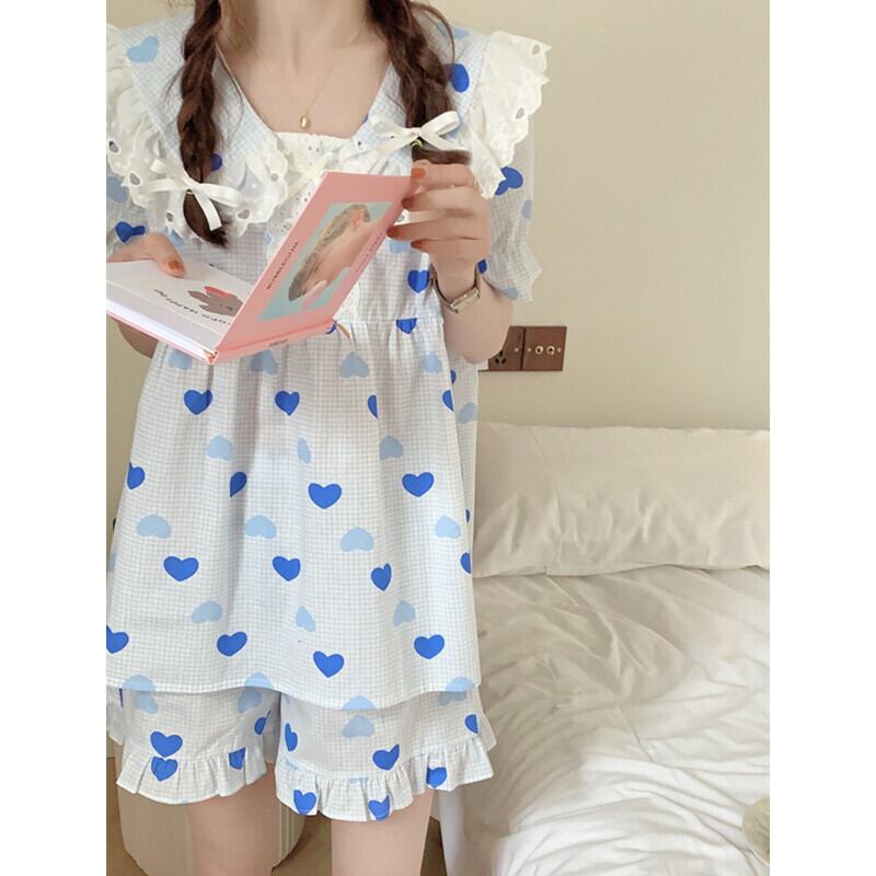 ハートプリント ブルー 清新 フリル 夏 リボン 半袖セット/ワンピース73846702