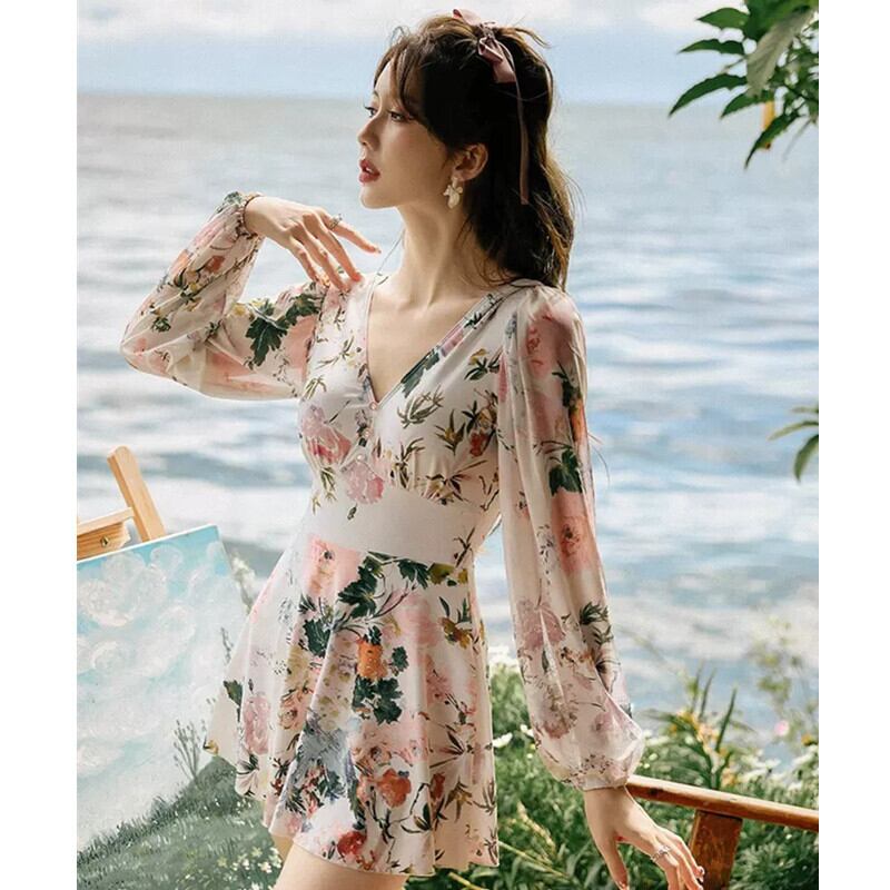 プリント小柄 Vネック エレガント Aライン 長袖 S M L LL ワンピース 水着74113581