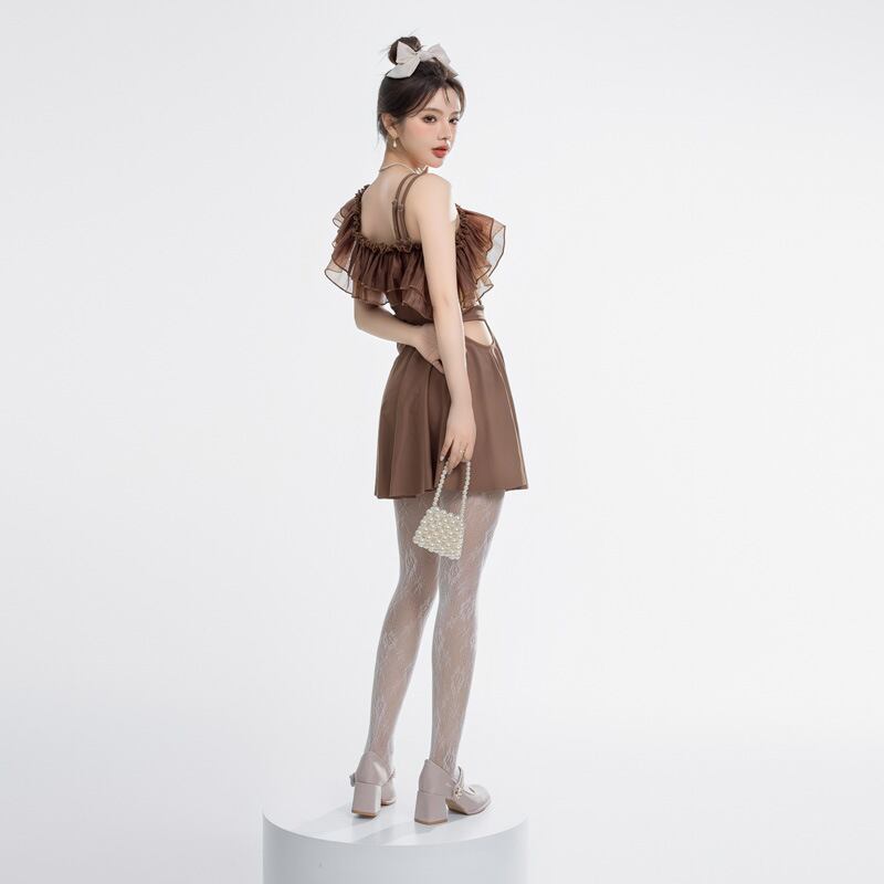 ins風 無地 フリル 透かし彫り オフショルダー M L LL パッド付き ワンピース 水着75107293
