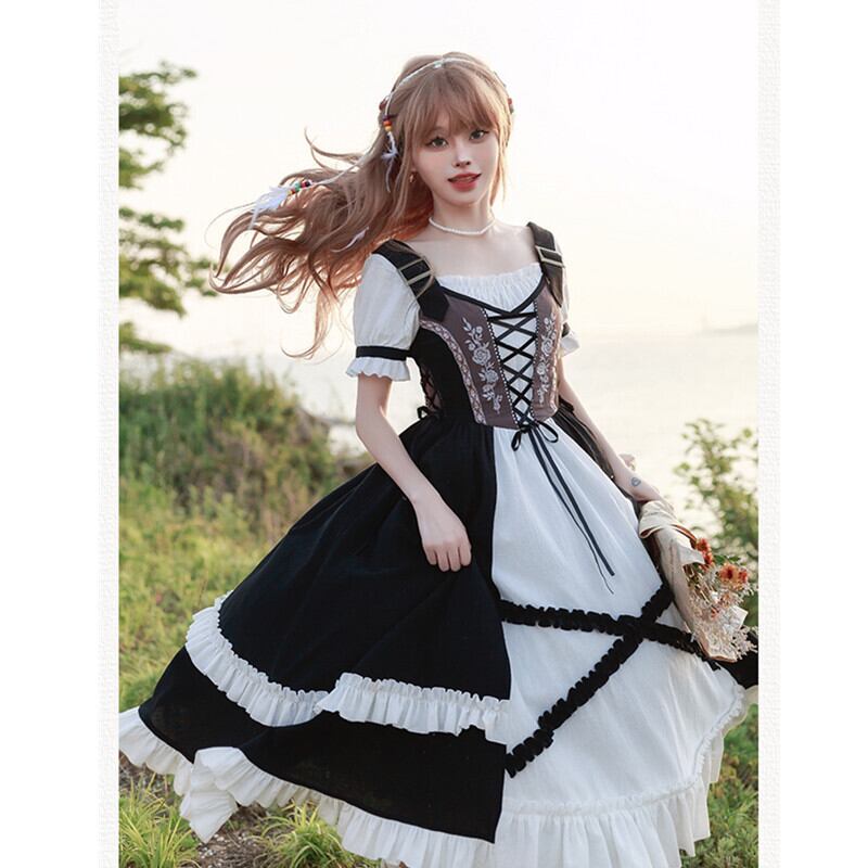 2023新作✿ローズ刺繍 リボン 半袖 森ガール 切り替えし ロング Lolita ロリータ OPワンピース75278319