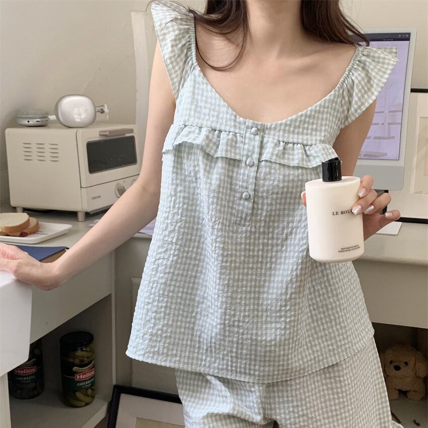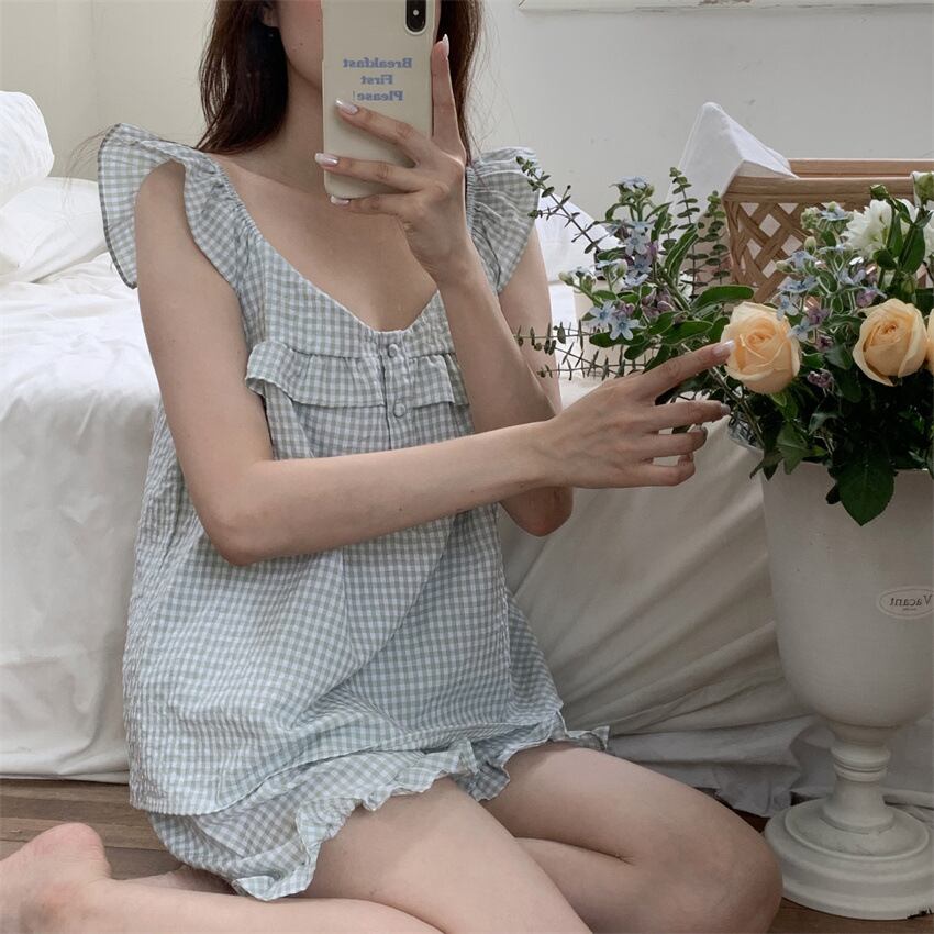 ✿2023新作 チェック柄 3色 Vネック フリル 夏 ルームウェア キャミソールセット・パジャマ75319939