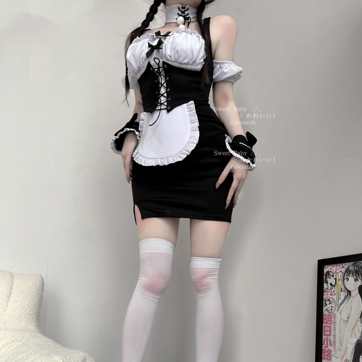 (4点)日系 かわいい スリット 誘惑 メイド服 コスプレ リボン お祭り 制服 撮影 M L ワンピース76376753