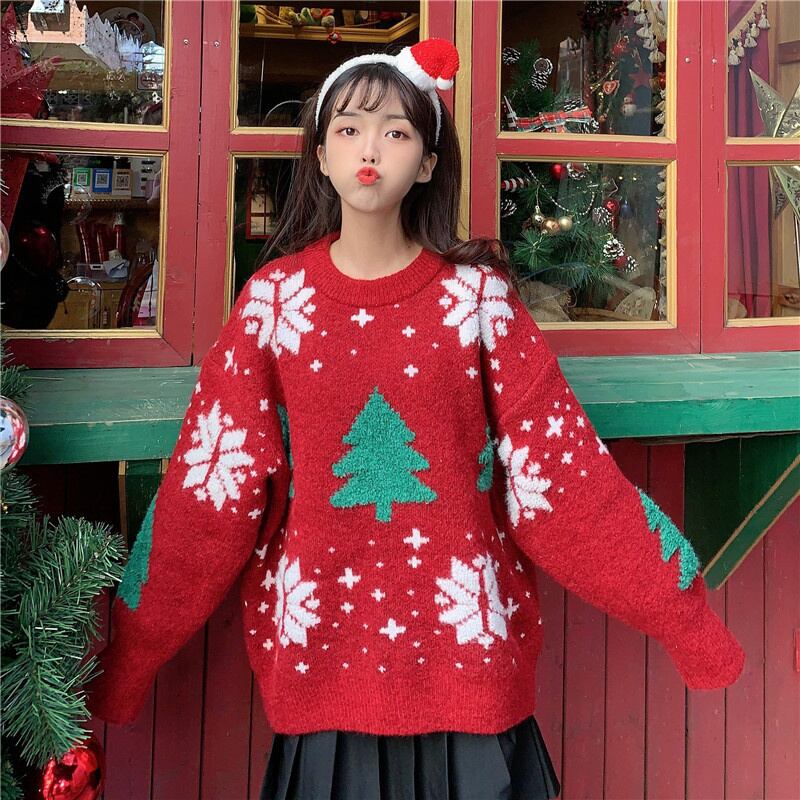 クリスマス 雪柄 トップス レッド ホワイト クリスマスツリー柄 セーター79716837